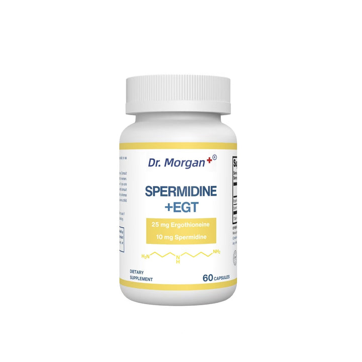 Dr. Morgan™ Spermidine + EGT is a daily dietary supplement that combines two naturally occurring compounds — Spermidine and L-Ergothioneine (EGT) — to support cellular function, oxidative balance, and healthy aging.