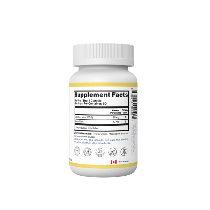 Each capsule delivers 10 mg of Spermidine and 25 mg of L-Ergothioneine, formulated using standardized plant-derived ingredients and produced in a GMP-certified facility in Canada.