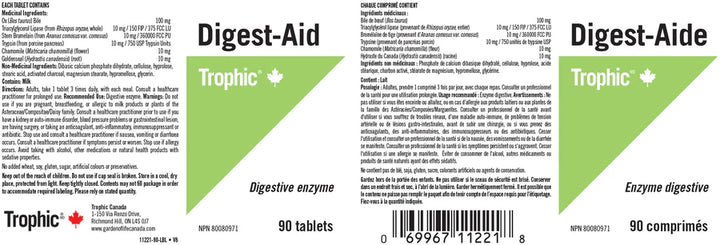 Digest-Aid contains three digestive enzymes, lipase, trypsin and bromelain. The herbs chamomile and goldenseal and the mineral charcoal have been added to further aid the digestive process. In the formula, lipase splits fats into two compounds: glycerine and fatty acids. Trypsin and bromelain are powerful proteolytic enzymes that digest proteins more rapidly and completely than pepsin. Goldenseal is traditionally used to soothe
