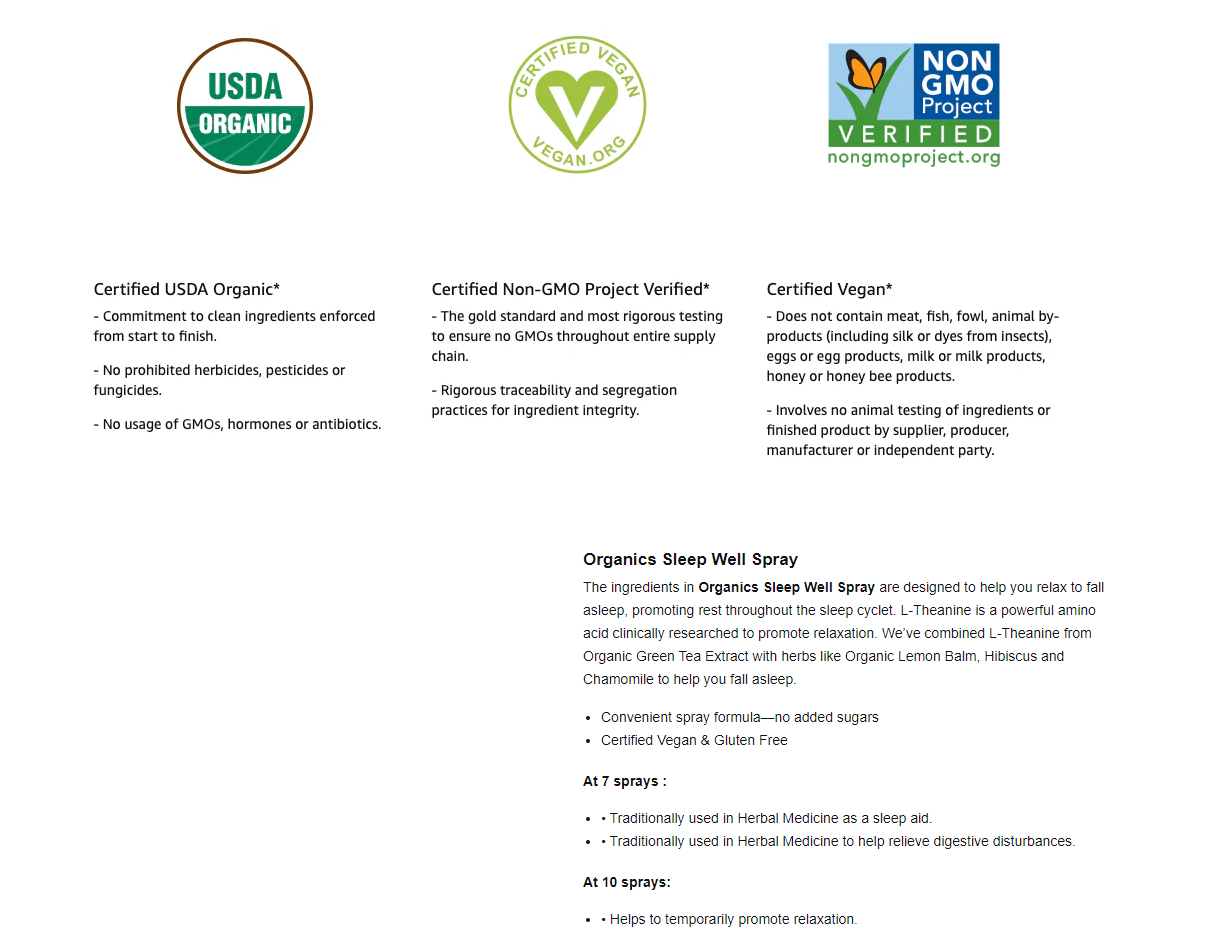 Organics Sleep Well Spray—and the entire line of Herbals—is Certified USDA Organic and Non-GMO Project Verified ensuring these herbals are clean and grown without toxic pesticides, herbicides or fungicides. We also use an Organic, Non-GMO Verified extraction method so no harsh chemicals or conventional corn alcohol are used.